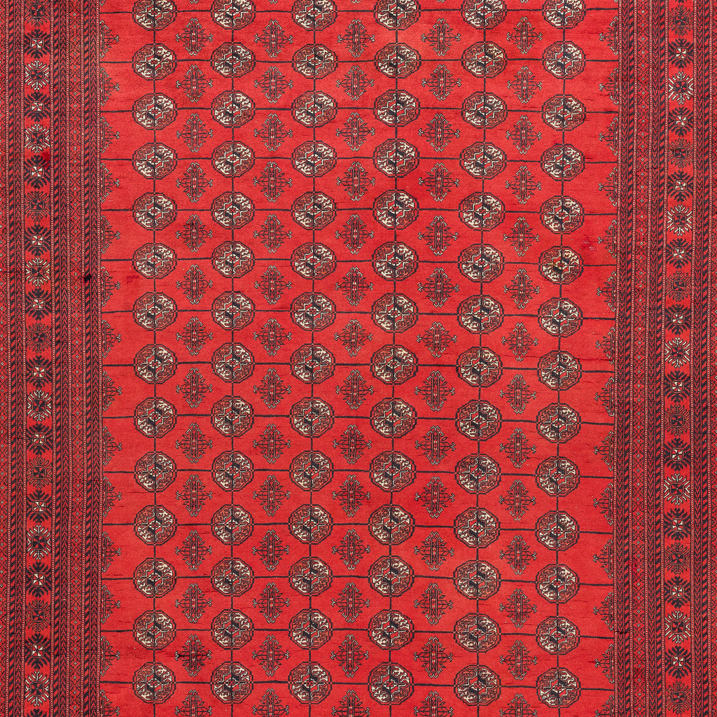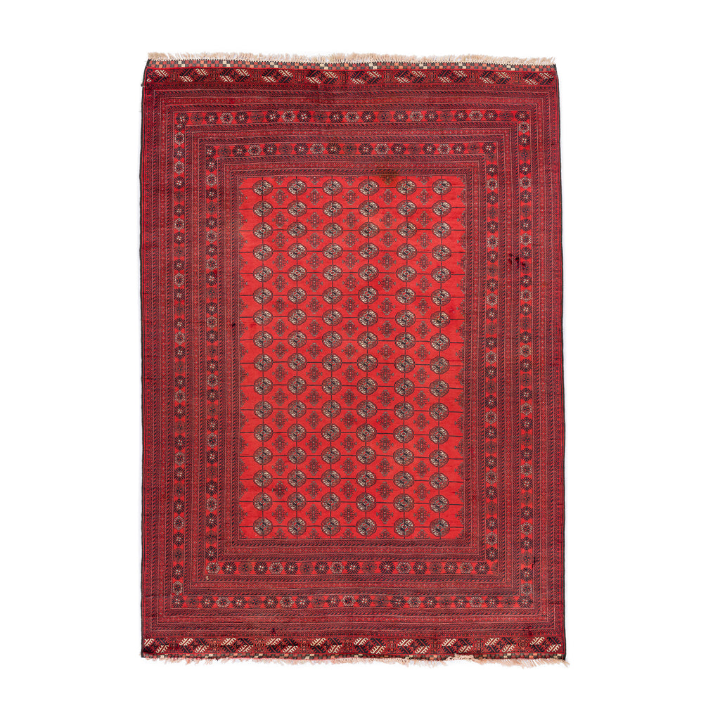 Afghan rugs are handwoven in northern and western Afghanistan, by various ethnic groups, mainly by Turkmen. A mix of various vegetable and other natural dyes are used to produce the rich colors displayed on these rugs. These rugs are mostly of medium sizes. Many patterns and colors are used, but the traditional and most typical is that of the octagonal elephant's foot (Bukhara) print, often with a red background. The weavers also produce other trappings of the nomadic lifestyle, including tent bags and ceremonial pieces.