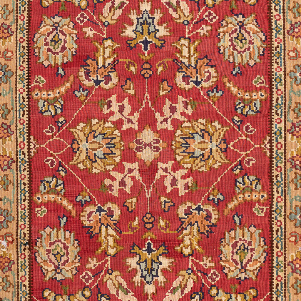 Made in Sharkoy, a small town on the northern shore of the Sea of Marmara, Sharkoy Kilims originate from the European side of Turkey. The designs consist of lively naturalistic patterns, with mainly floral, tree-of-life, bird, and leaf-and-vine motifs, sometimes set in prayer arches or borders. Diamond-shaped medallions are also occasionally encountered in these designs.