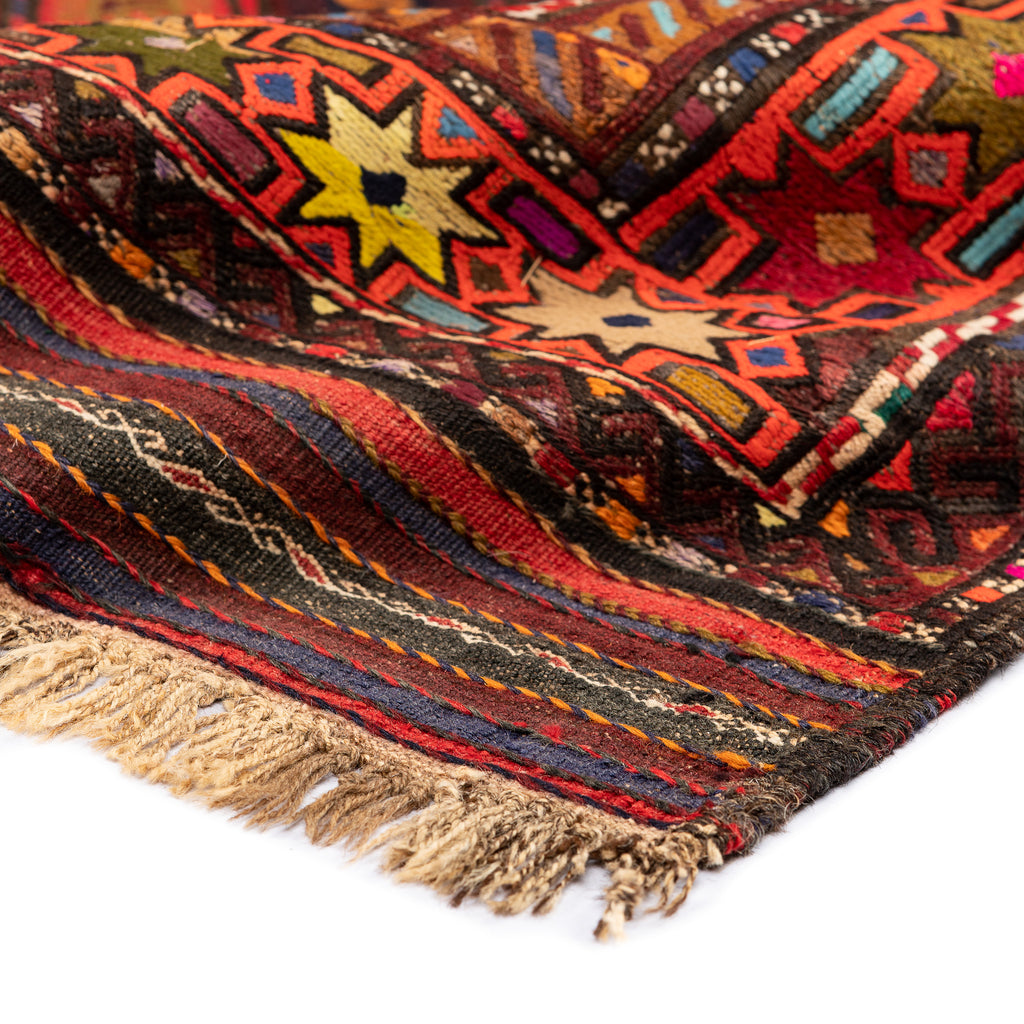 Soumak Kilims, made by the Baloch people on the Persia-Afghan border, are handwoven using a unique type of flat weave with a smooth front face and a ragged back. Unlike most kilims, the back is left ragged, with all the loose ends of the differently colored weft threads visible, providing extra thickness and warmth.