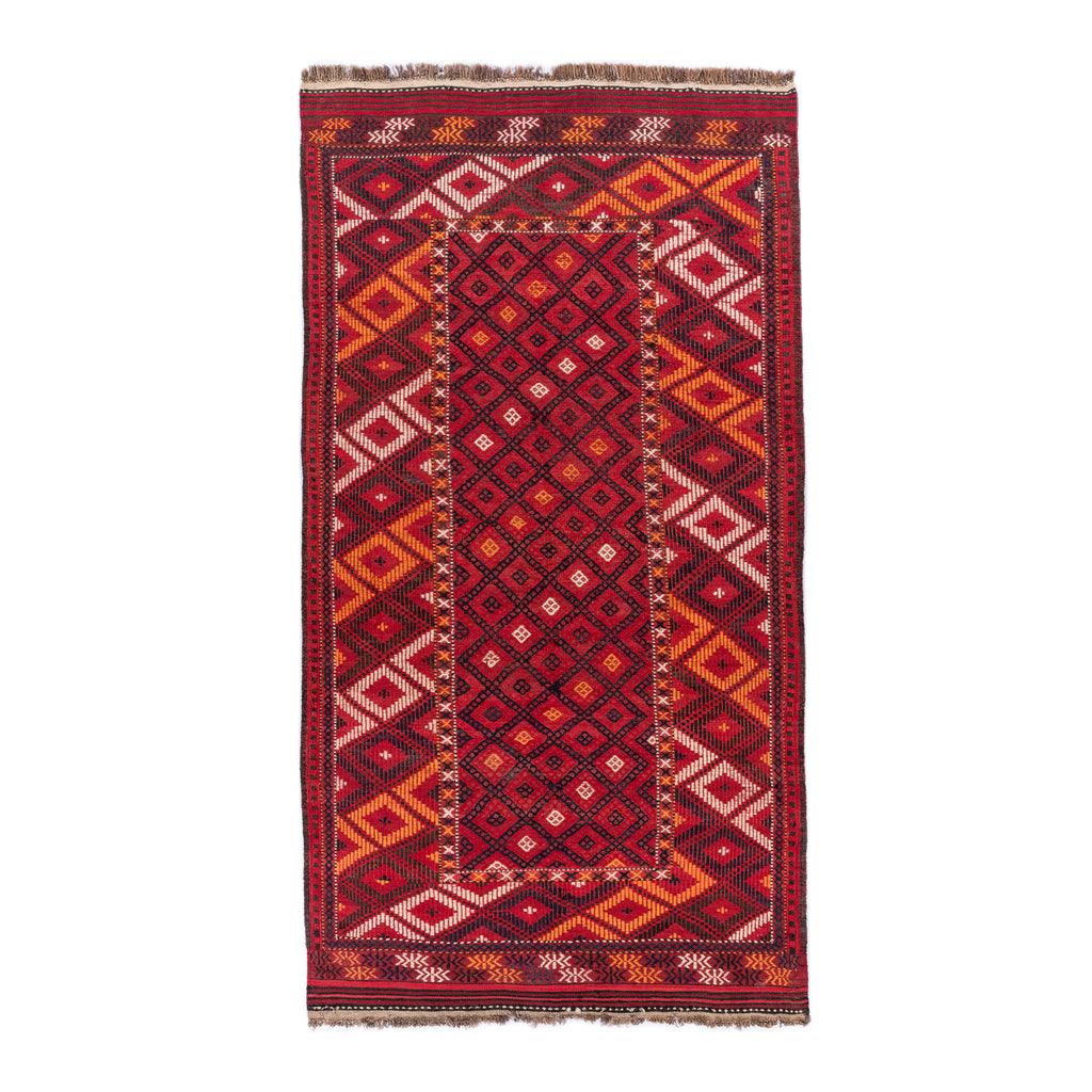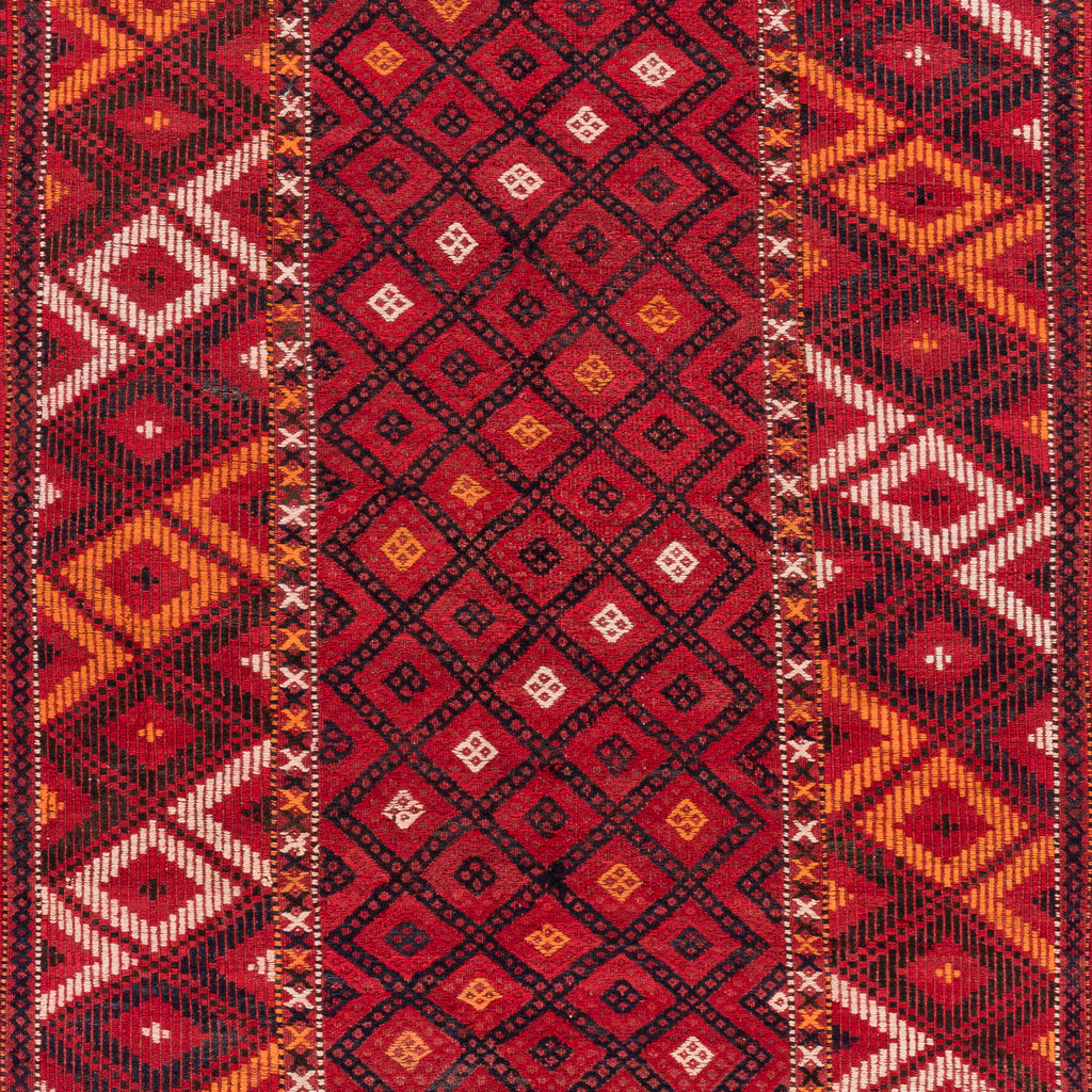 Soumak Kilims, made by the Baloch people on the Persia-Afghan border, are handwoven using a unique type of flat weave with a smooth front face and a ragged back. Unlike most kilims, the back is left ragged, with all the loose ends of the differently colored weft threads visible, providing extra thickness and warmth.