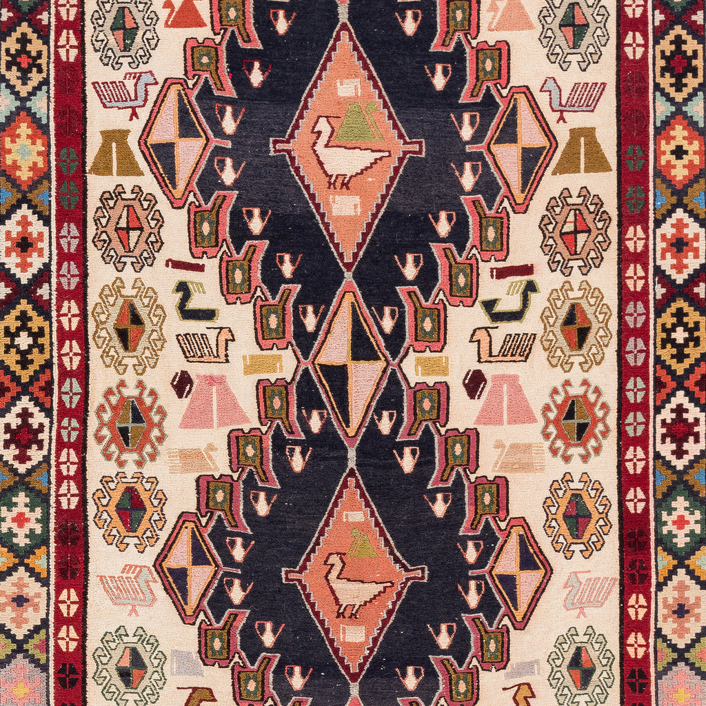 Soumak Kilims, made by the Baloch people on the Persia-Afghan border, are handwoven using a unique type of flat weave with a smooth front face and a ragged back. Unlike most kilims, the back is left ragged, with all the loose ends of the differently colored weft threads visible, providing extra thickness and warmth.