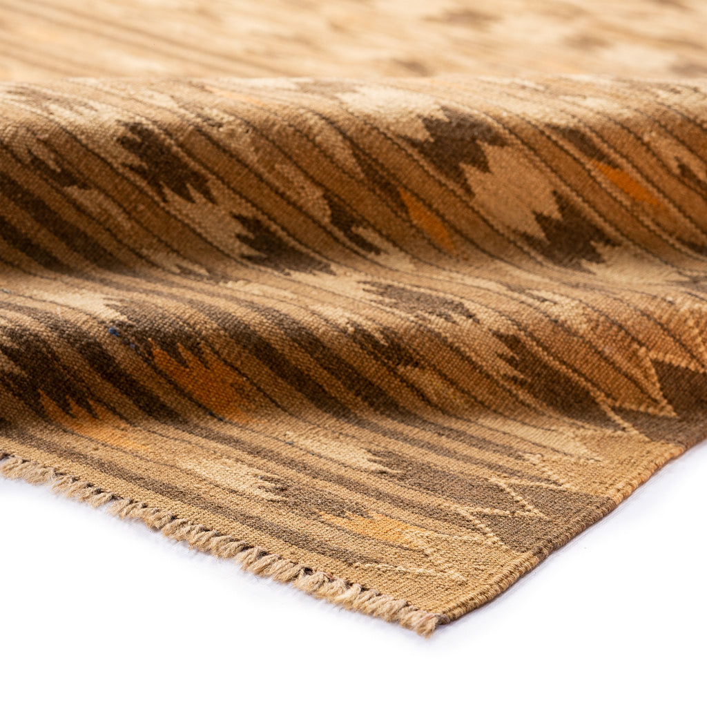 Turkmen Kilims are woven by the traditional desert nomads of Turkmenistan using durable local wool. A unique weaving technique is used, which allows thinner carpets to be produced with the same motif on both sides, making them reversible. Turkmen Kilims usually have often geometric designs as the weaving technique implies certain limitations, resulting in a banded pattern. They are produced from good quality wool and will help you give your home an Oriental feel.