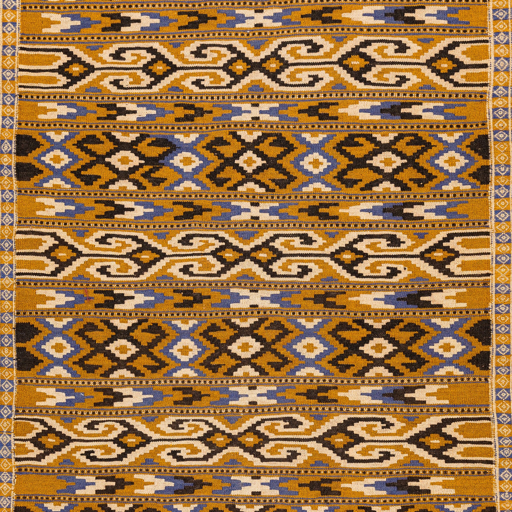 Turkmen Kilims are woven by the traditional desert nomads of Turkmenistan using durable local wool. A unique weaving technique is used, which allows thinner carpets to be produced with the same motif on both sides, making them reversible. Turkmen Kilims usually have often geometric designs as the weaving technique implies certain limitations, resulting in a banded pattern. They are produced from good quality wool and will help you give your home an Oriental feel.