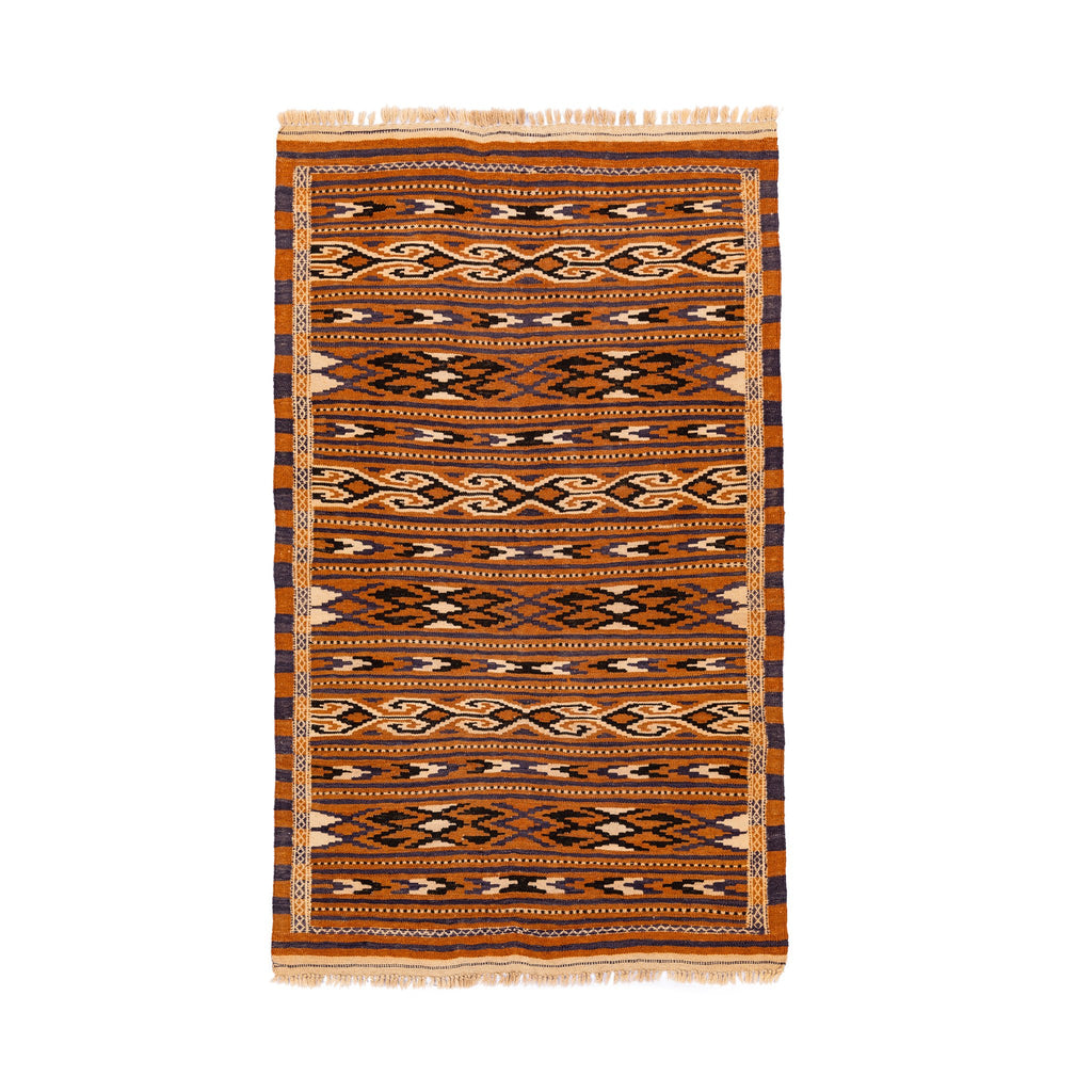 Turkmen Kilims are woven by the traditional desert nomads of Turkmenistan using durable local wool. A unique weaving technique is used, which allows thinner carpets to be produced with the same motif on both sides, making them reversible. Turkmen Kilims usually have often geometric designs as the weaving technique implies certain limitations, resulting in a banded pattern. They are produced from good quality wool and will help you give your home an Oriental feel.