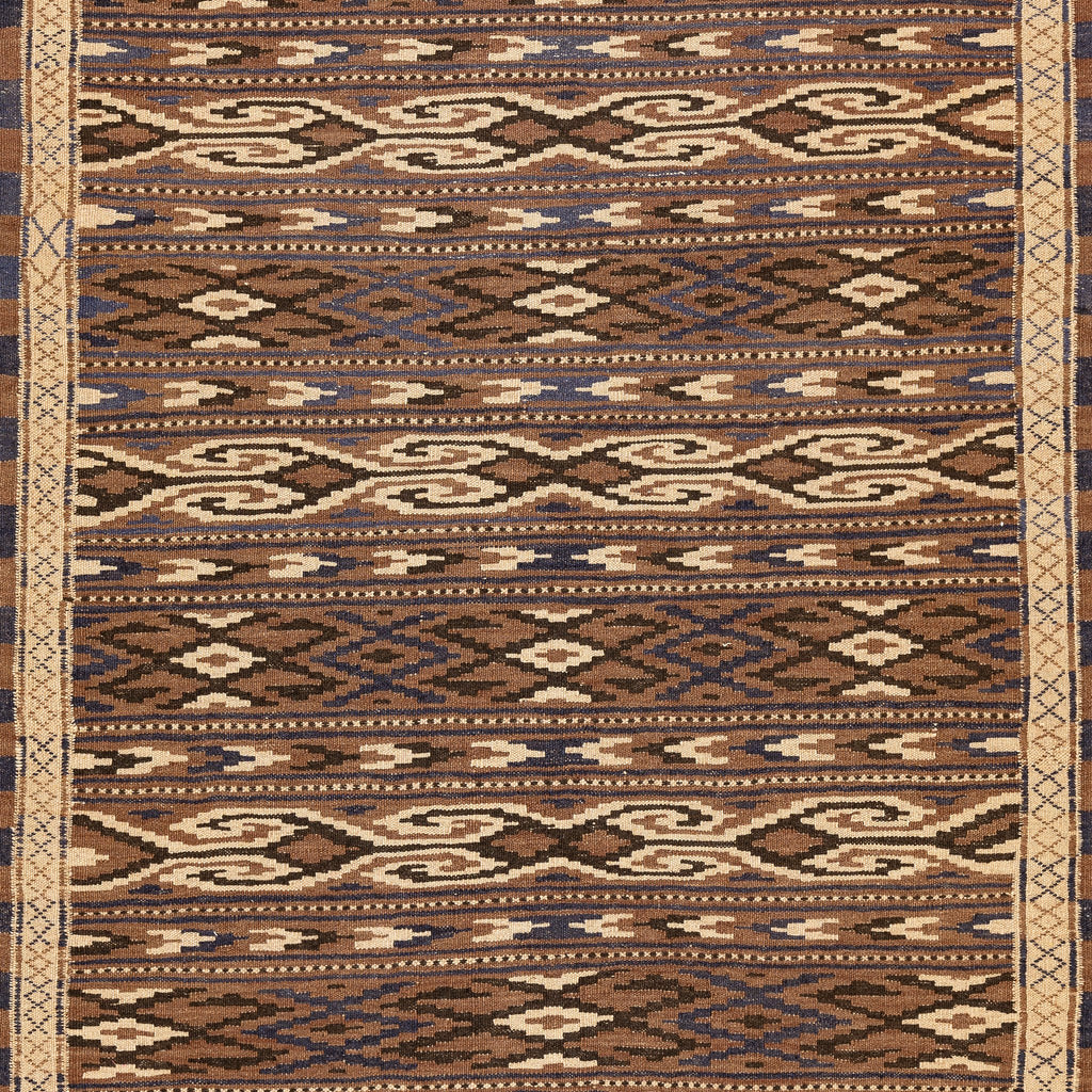 Turkmen Kilims are woven by the traditional desert nomads of Turkmenistan using durable local wool. A unique weaving technique is used, which allows thinner carpets to be produced with the same motif on both sides, making them reversible. Turkmen Kilims usually have often geometric designs as the weaving technique implies certain limitations, resulting in a banded pattern. They are produced from good quality wool and will help you give your home an Oriental feel.
