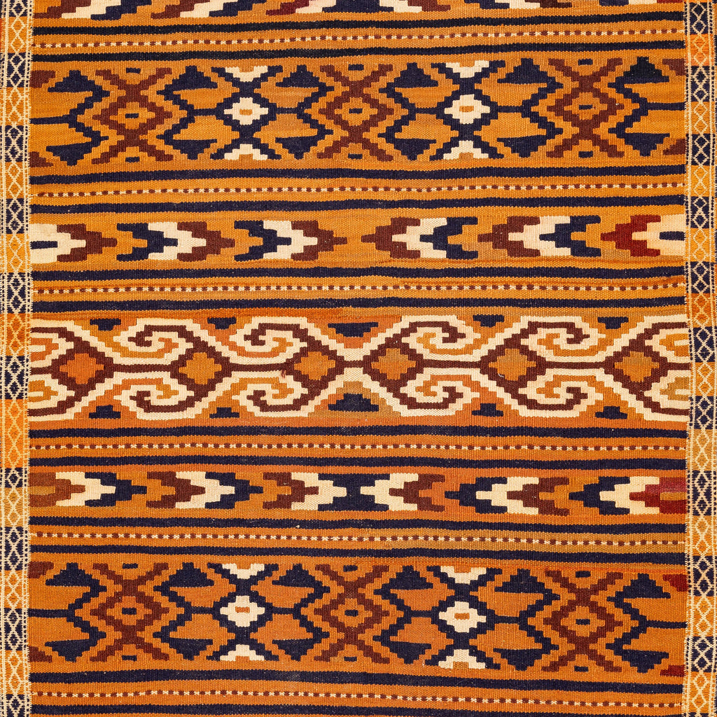 Turkmen Kilims are woven by the traditional desert nomads of Turkmenistan using durable local wool. A unique weaving technique is used, which allows thinner carpets to be produced with the same motif on both sides, making them reversible. Turkmen Kilims usually have often geometric designs as the weaving technique implies certain limitations, resulting in a banded pattern. They are produced from good quality wool and will help you give your home an Oriental feel.
