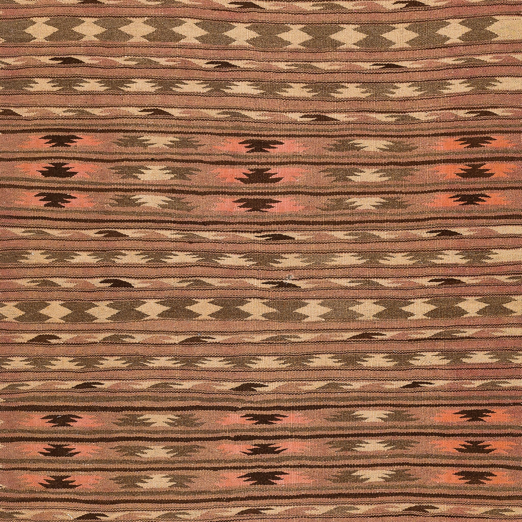 Turkmen Kilims are woven by the traditional desert nomads of Turkmenistan using durable local wool. A unique weaving technique is used, which allows thinner carpets to be produced with the same motif on both sides, making them reversible. Turkmen Kilims usually have often geometric designs as the weaving technique implies certain limitations, resulting in a banded pattern. They are produced from good quality wool and will help you give your home an Oriental feel.