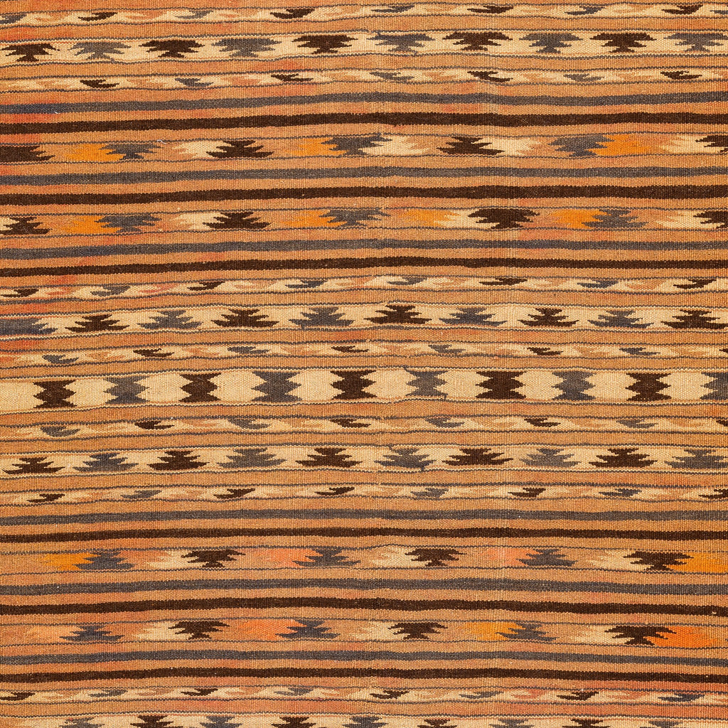 Turkmen Kilims are woven by the traditional desert nomads of Turkmenistan using durable local wool. A unique weaving technique is used, which allows thinner carpets to be produced with the same motif on both sides, making them reversible. Turkmen Kilims usually have often geometric designs as the weaving technique implies certain limitations, resulting in a banded pattern. They are produced from good quality wool and will help you give your home an Oriental feel.