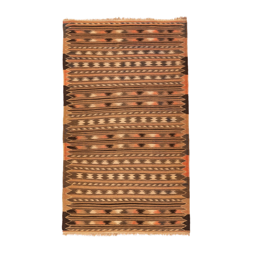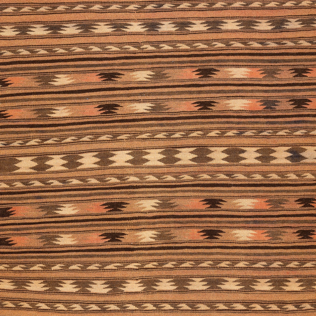Turkmen Kilims are woven by the traditional desert nomads of Turkmenistan using durable local wool. A unique weaving technique is used, which allows thinner carpets to be produced with the same motif on both sides, making them reversible. Turkmen Kilims usually have often geometric designs as the weaving technique implies certain limitations, resulting in a banded pattern. They are produced from good quality wool and will help you give your home an Oriental feel.