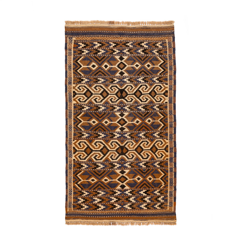 Turkmen Kilims are woven by the traditional desert nomads of Turkmenistan using durable local wool. A unique weaving technique is used, which allows thinner carpets to be produced with the same motif on both sides, making them reversible. Turkmen Kilims usually have often geometric designs as the weaving technique implies certain limitations, resulting in a banded pattern. They are produced from good quality wool and will help you give your home an Oriental feel.