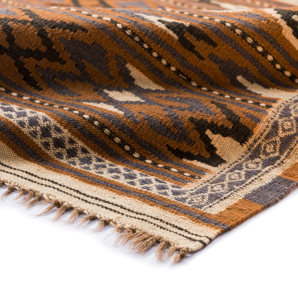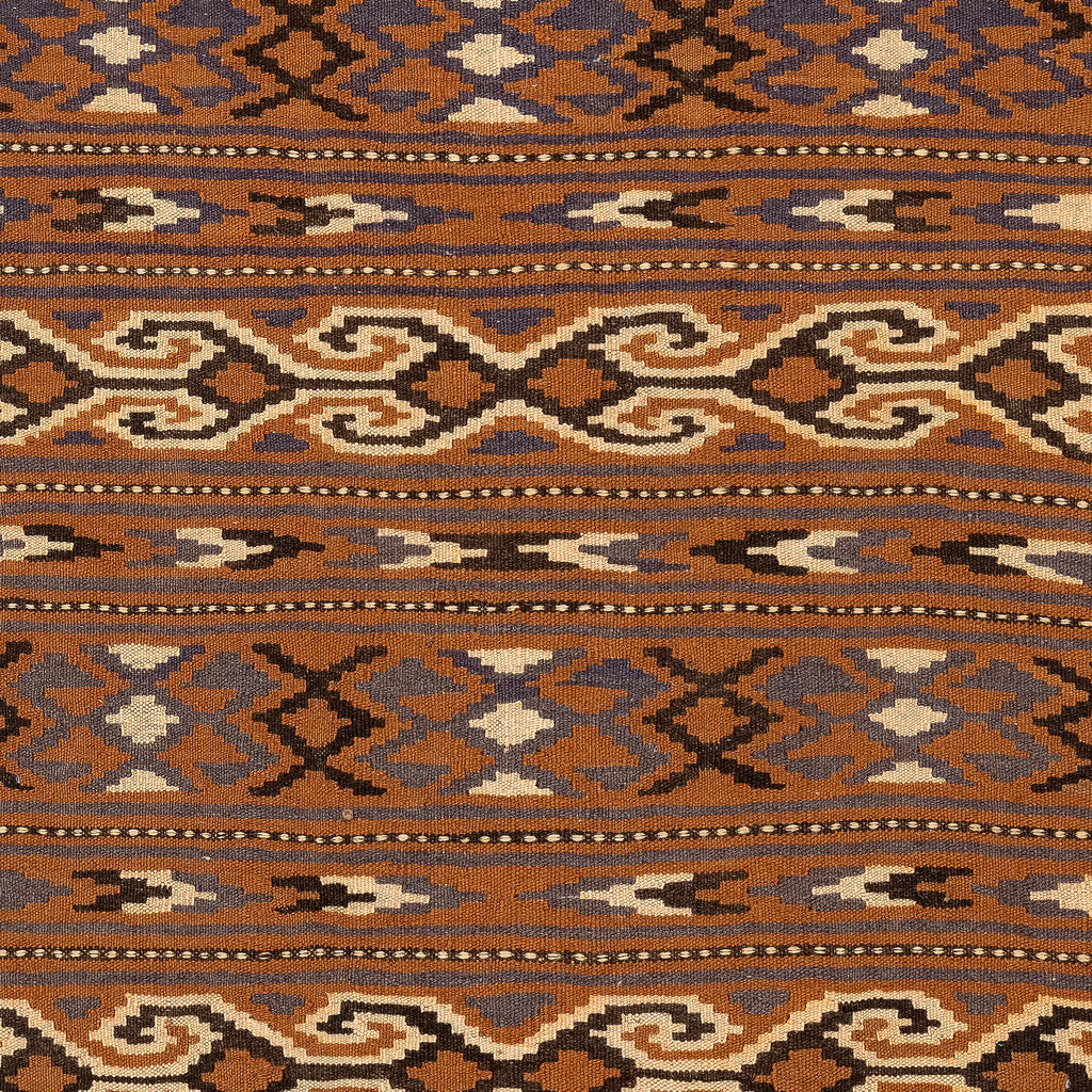 Turkmen Kilims are woven by the traditional desert nomads of Turkmenistan using durable local wool. A unique weaving technique is used, which allows thinner carpets to be produced with the same motif on both sides, making them reversible. Turkmen Kilims usually have often geometric designs as the weaving technique implies certain limitations, resulting in a banded pattern. They are produced from good quality wool and will help you give your home an Oriental feel.