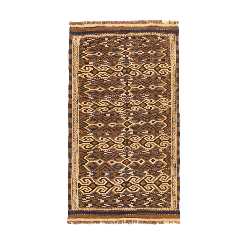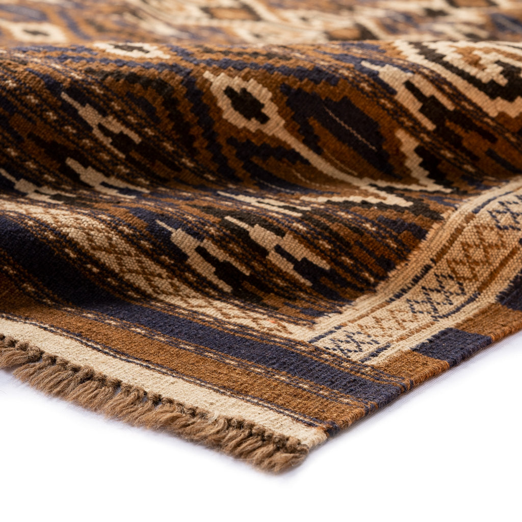 Turkmen Kilims are woven by the traditional desert nomads of Turkmenistan using durable local wool. A unique weaving technique is used, which allows thinner carpets to be produced with the same motif on both sides, making them reversible. Turkmen Kilims usually have often geometric designs as the weaving technique implies certain limitations, resulting in a banded pattern. They are produced from good quality wool and will help you give your home an Oriental feel.