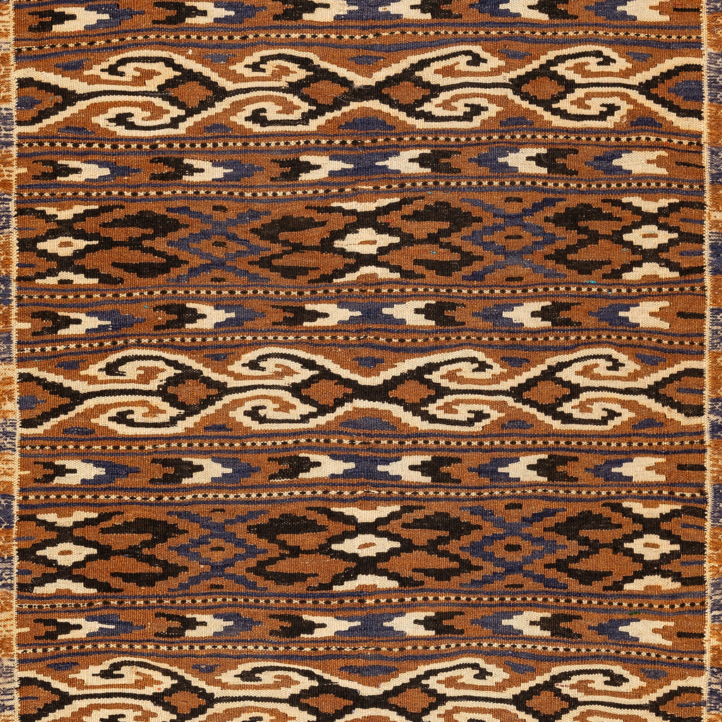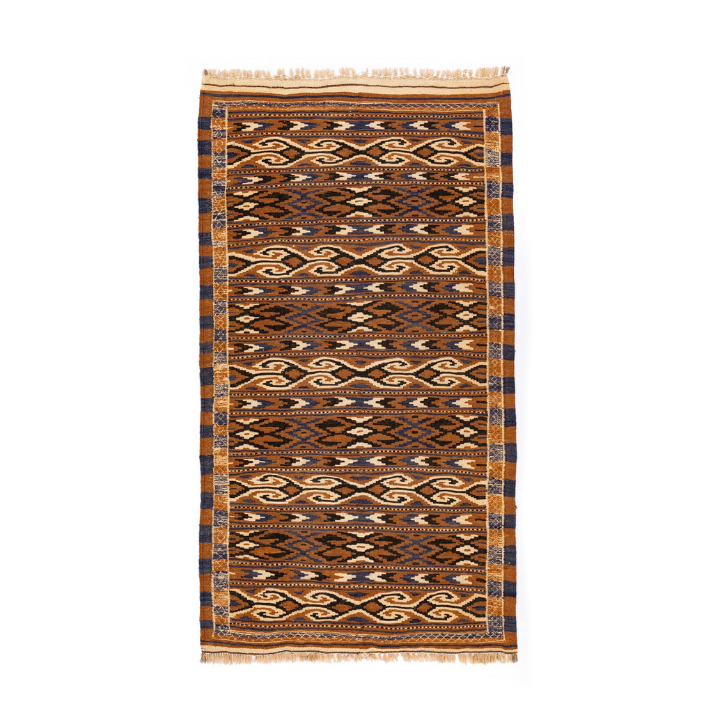 are woven by the traditional desert nomads of Turkmenistan using durable local wool. A unique weaving technique is used, which allows thinner carpets to be produced with the same motif on both sides, making them reversible. Turkmen Kilims usually have often geometric designs as the weaving technique implies certain limitations, resulting in a banded pattern. They are produced from good quality wool and will help you give your home an Oriental feel.