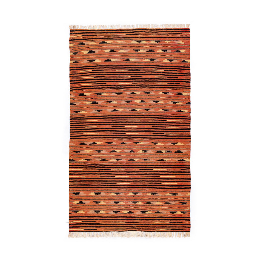 Turkmen Kilims are woven by the traditional desert nomads of Turkmenistan using durable local wool. A unique weaving technique is used, which allows thinner carpets to be produced with the same motif on both sides, making them reversible. Turkmen Kilims usually have often geometric designs as the weaving technique implies certain limitations, resulting in a banded pattern. They are produced from good quality wool and will help you give your home an Oriental feel.