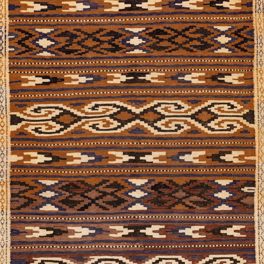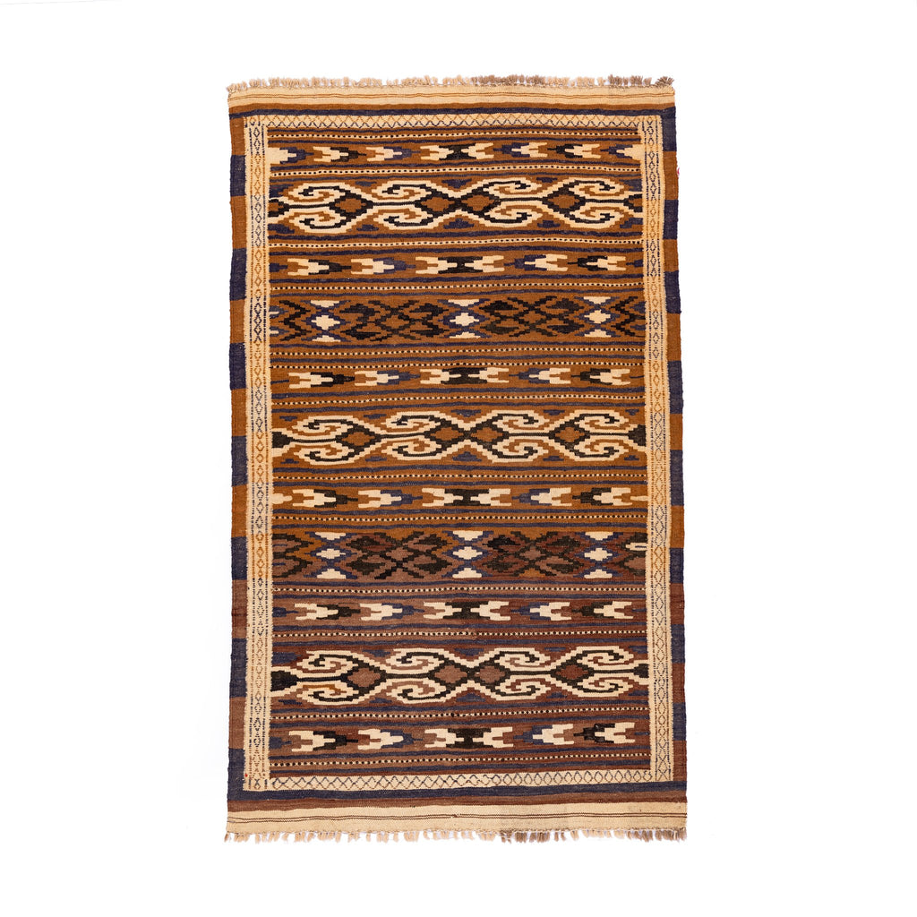 are woven by the traditional desert nomads of Turkmenistan using durable local wool. A unique weaving technique is used, which allows thinner carpets to be produced with the same motif on both sides, making them reversible. Turkmen Kilims usually have often geometric designs as the weaving technique implies certain limitations, resulting in a banded pattern. They are produced from good quality wool and will help you give your home an Oriental feel.