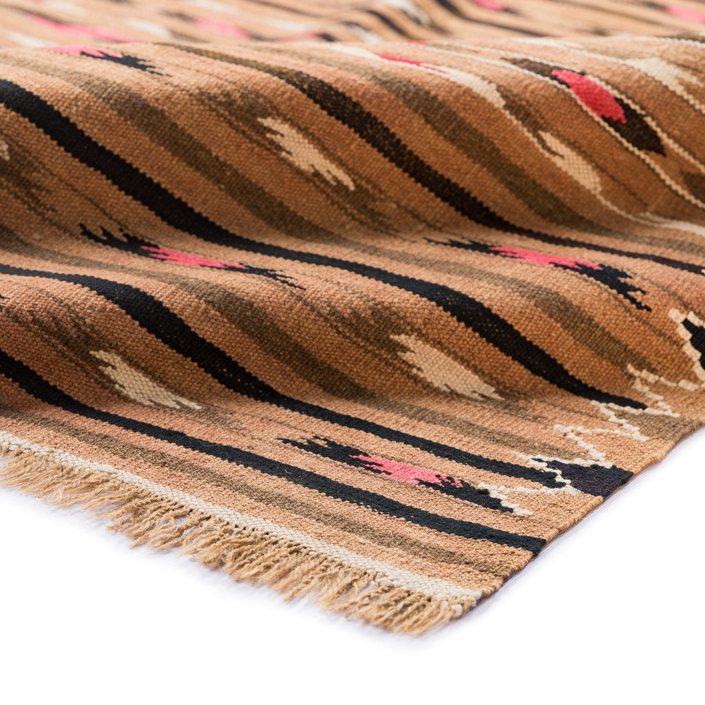 are woven by the traditional desert nomads of Turkmenistan using durable local wool. A unique weaving technique is used, which allows thinner carpets to be produced with the same motif on both sides, making them reversible. Turkmen Kilims usually have often geometric designs as the weaving technique implies certain limitations, resulting in a banded pattern. They are produced from good quality wool and will help you give your home an Oriental feel.