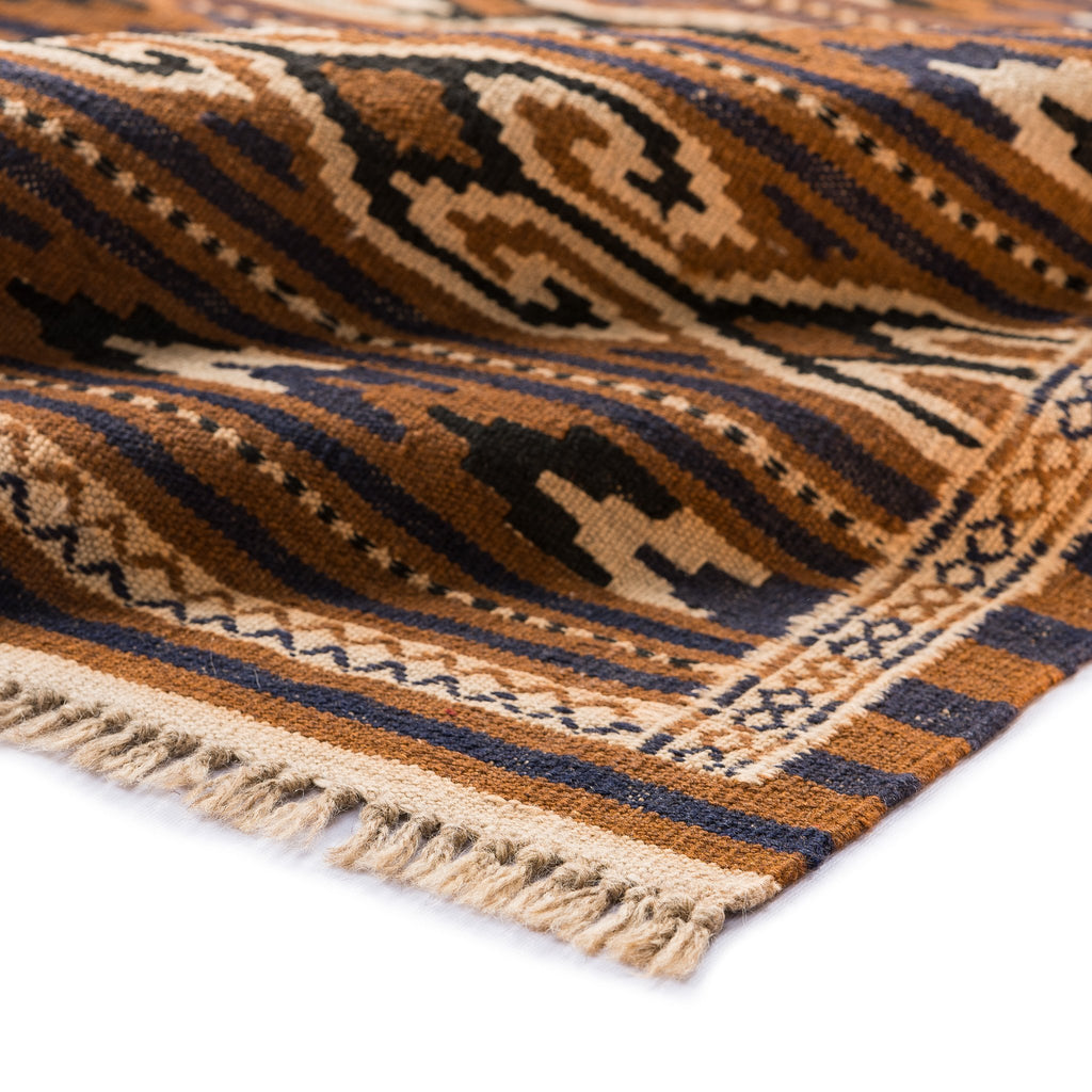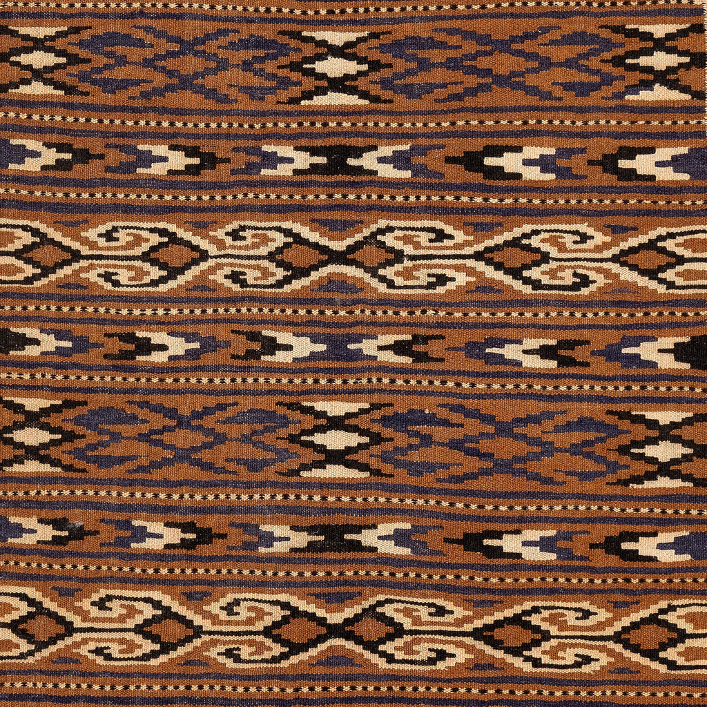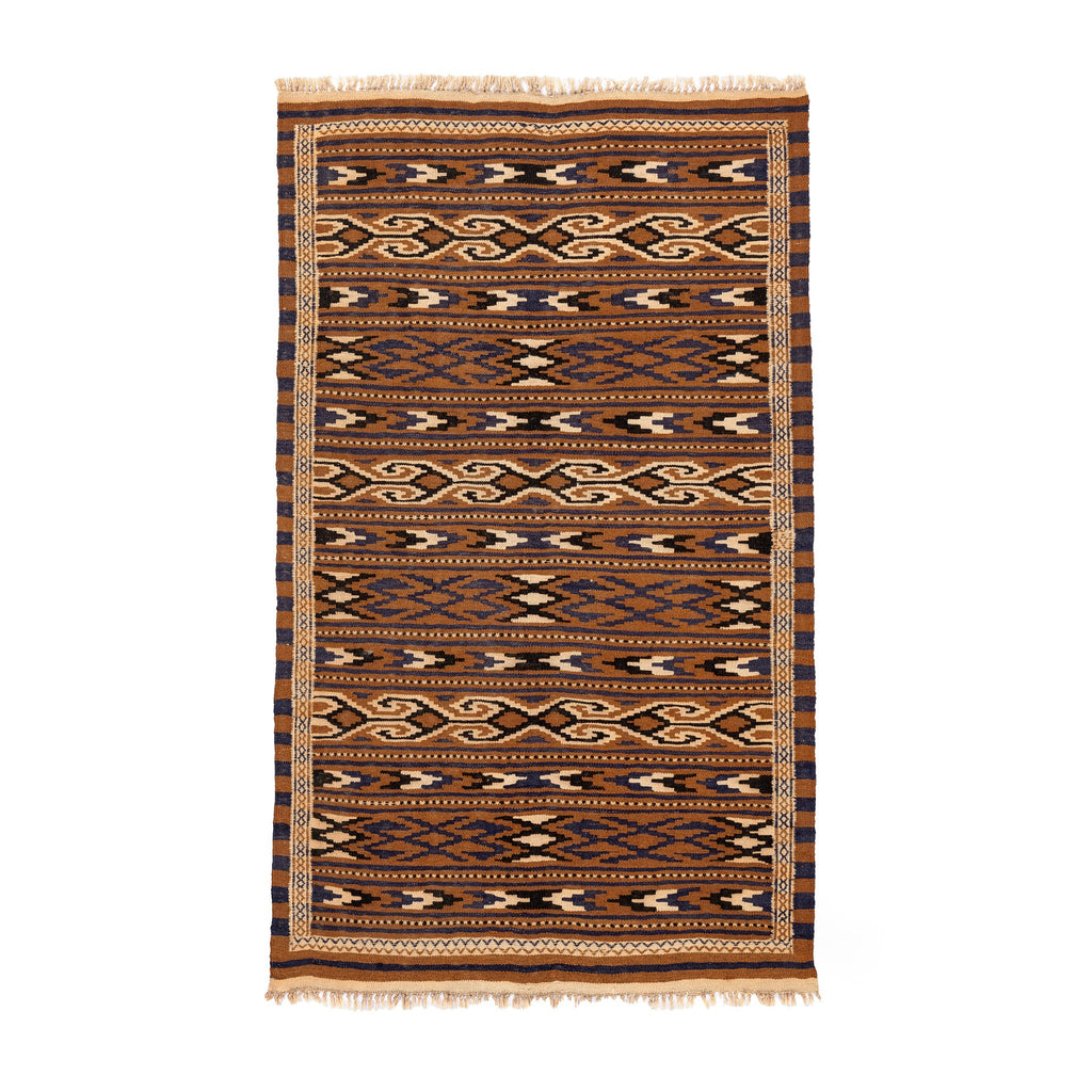 Turkmen Kilims are woven by the traditional desert nomads of Turkmenistan using durable local wool. A unique weaving technique is used, which allows thinner carpets to be produced with the same motif on both sides, making them reversible. Turkmen Kilims usually have often geometric designs as the weaving technique implies certain limitations, resulting in a banded pattern. They are produced from good quality wool and will help you give your home an Oriental feel.