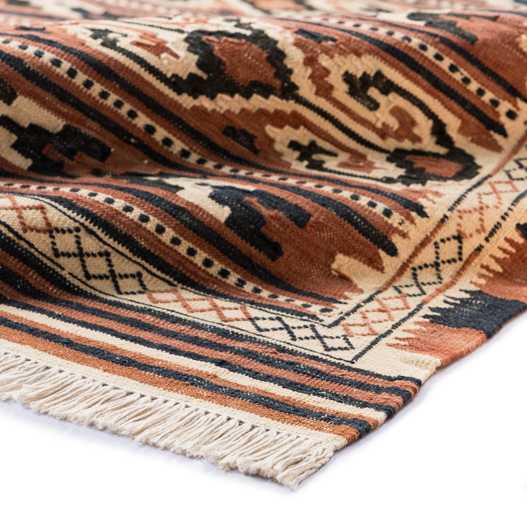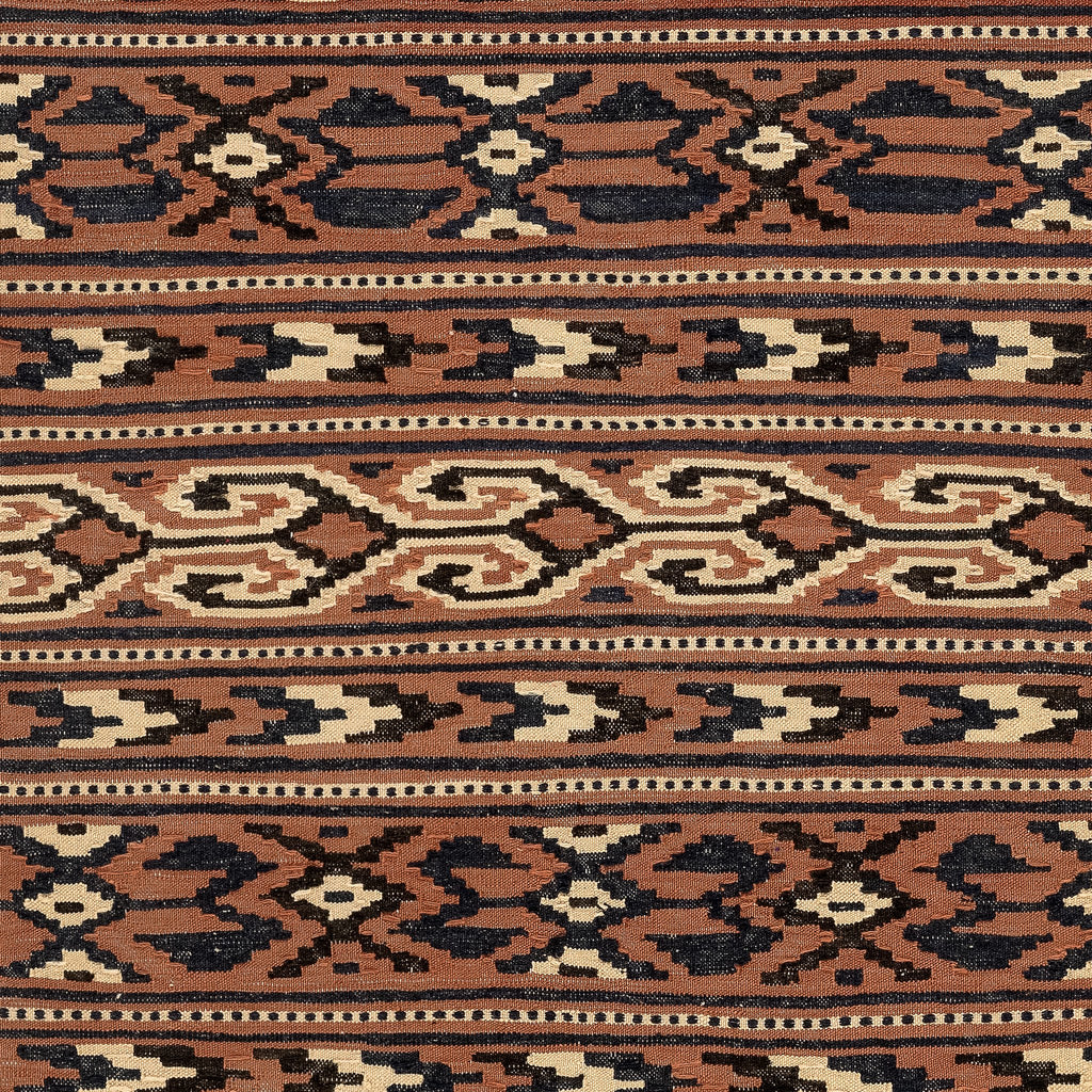 Turkmen Kilims are woven by the traditional desert nomads of Turkmenistan using durable local wool. A unique weaving technique is used, which allows thinner carpets to be produced with the same motif on both sides, making them reversible. Turkmen Kilims usually have often geometric designs as the weaving technique implies certain limitations, resulting in a banded pattern. They are produced from good quality wool and will help you give your home an Oriental feel.