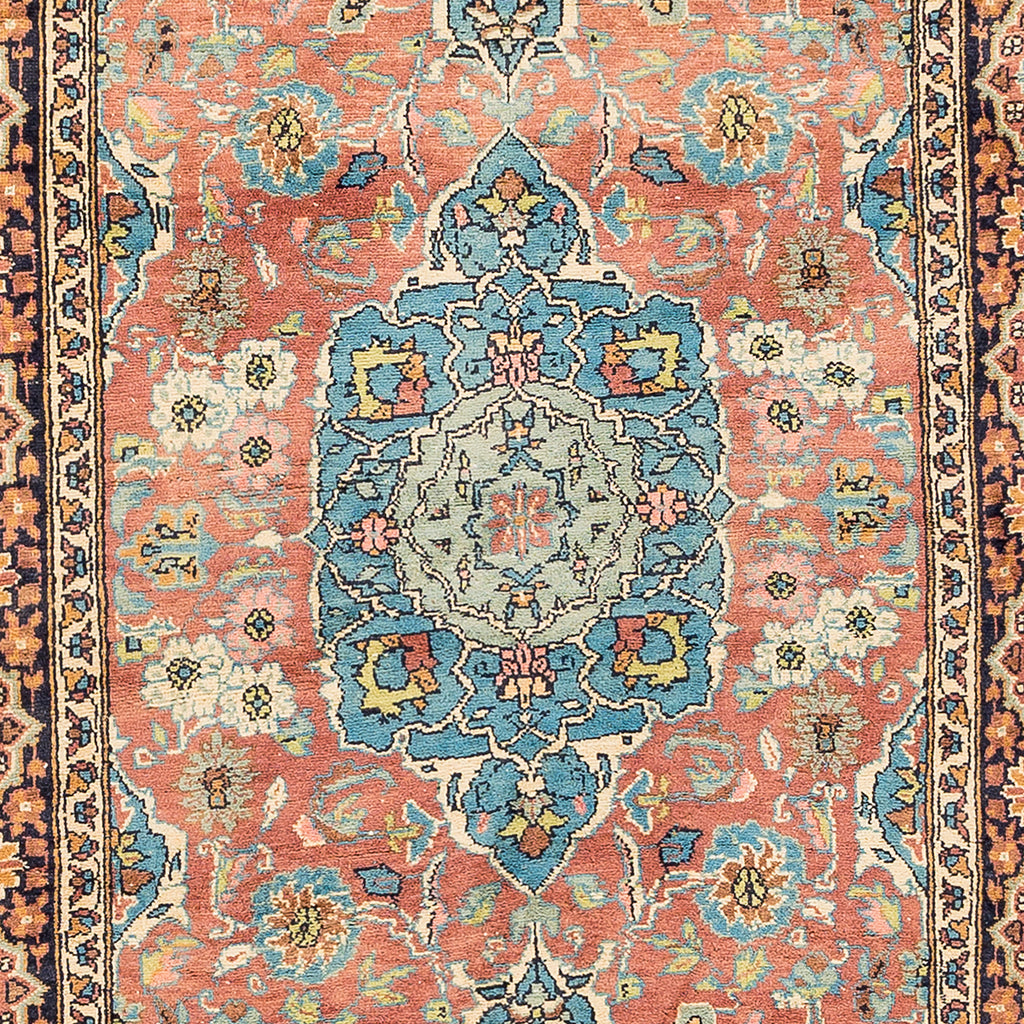 The carpets are manufactured with high knot density, warp, and weft of cotton, and the wool for the pile is of high quality. The patterns consist of beautifully designed medallions, niches, trees, and figural motifs, and all-over floral motifs occur also. Dominating colors are blue, red, and beige.