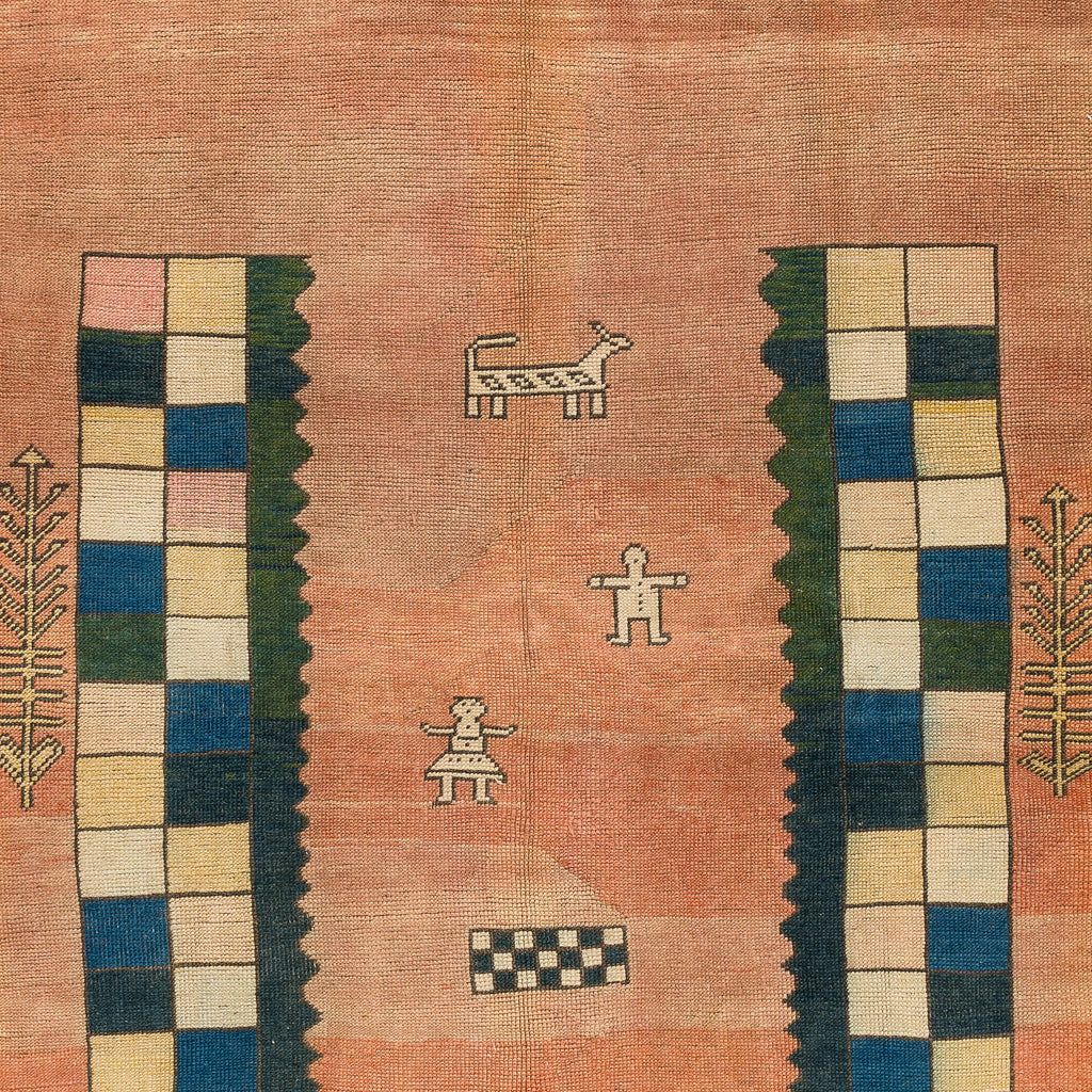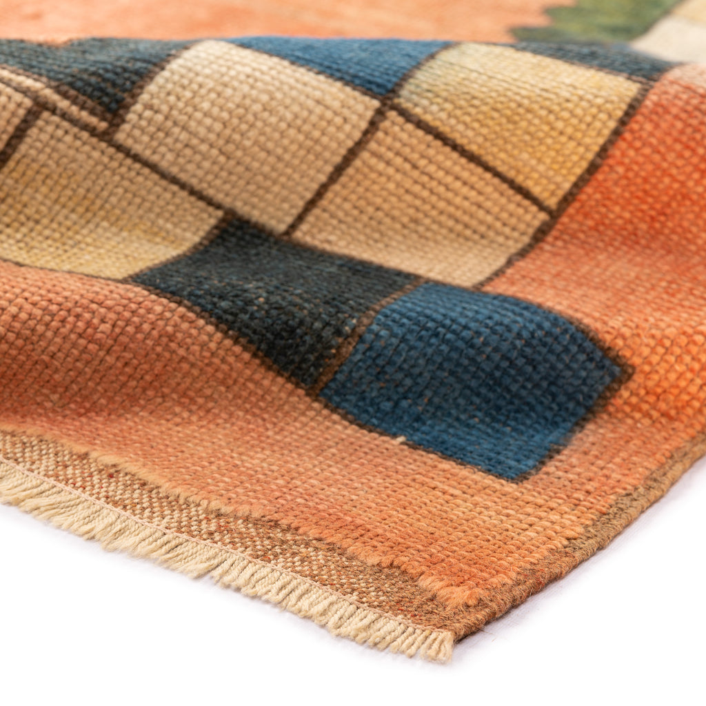 Traditionally a sleeping rug, a Gabbeh is a hand-woven pile rug characterized by an abstract design that relies upon open fields of color and a playfulness with geometry. Gabbeh carpets are much thicker than other Persian rugs. The word Gabbeh comes from the Persian word gabbe, meaning raw, natural, uncut.