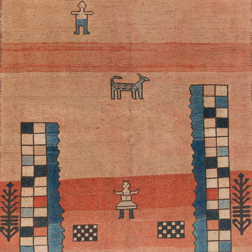 Traditionally a sleeping rug, a Gabbeh is a hand-woven pile rug characterized by an abstract design that relies upon open fields of color and a playfulness with geometry. Gabbeh carpets are much thicker than other Persian rugs. The word Gabbeh comes from the Persian word gabbe, meaning raw, natural, uncut.