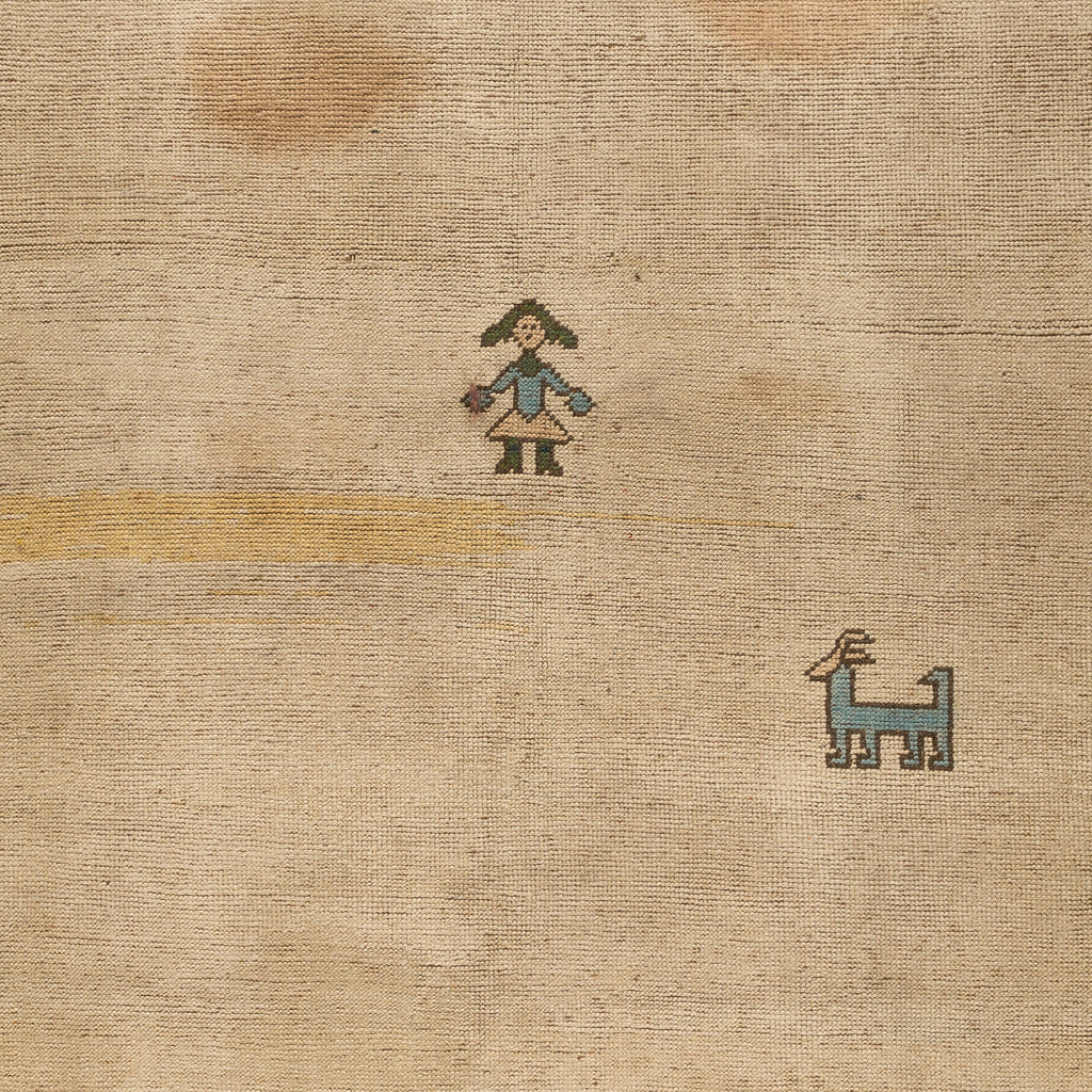 A Gabbeh rug displays playful simplicity in its design, with a limited number of decorative, mostly rectangular shapes resembling mainly animals. Usually, bright colors are used, such as yellow and red. Gabbehs are made of natural, handspun wool yarn, and all the colors are created with natural plant dye.