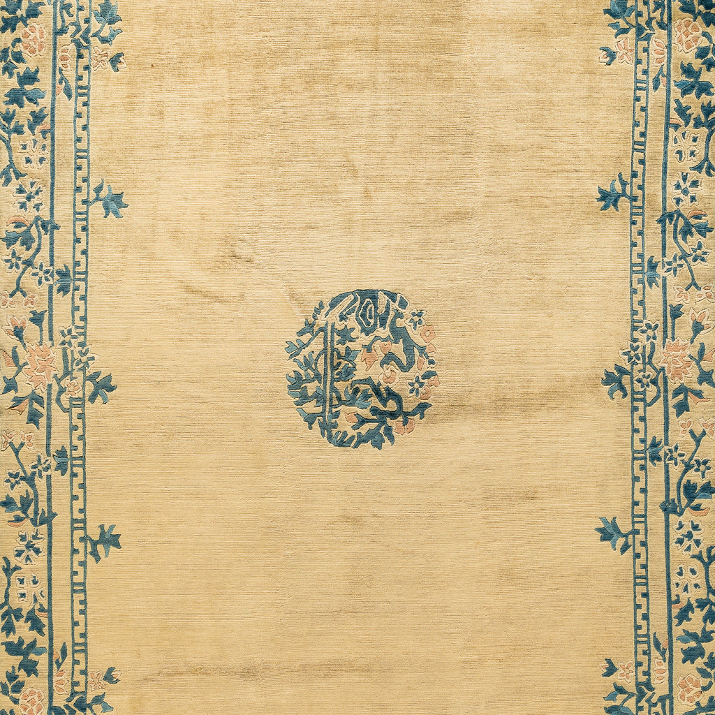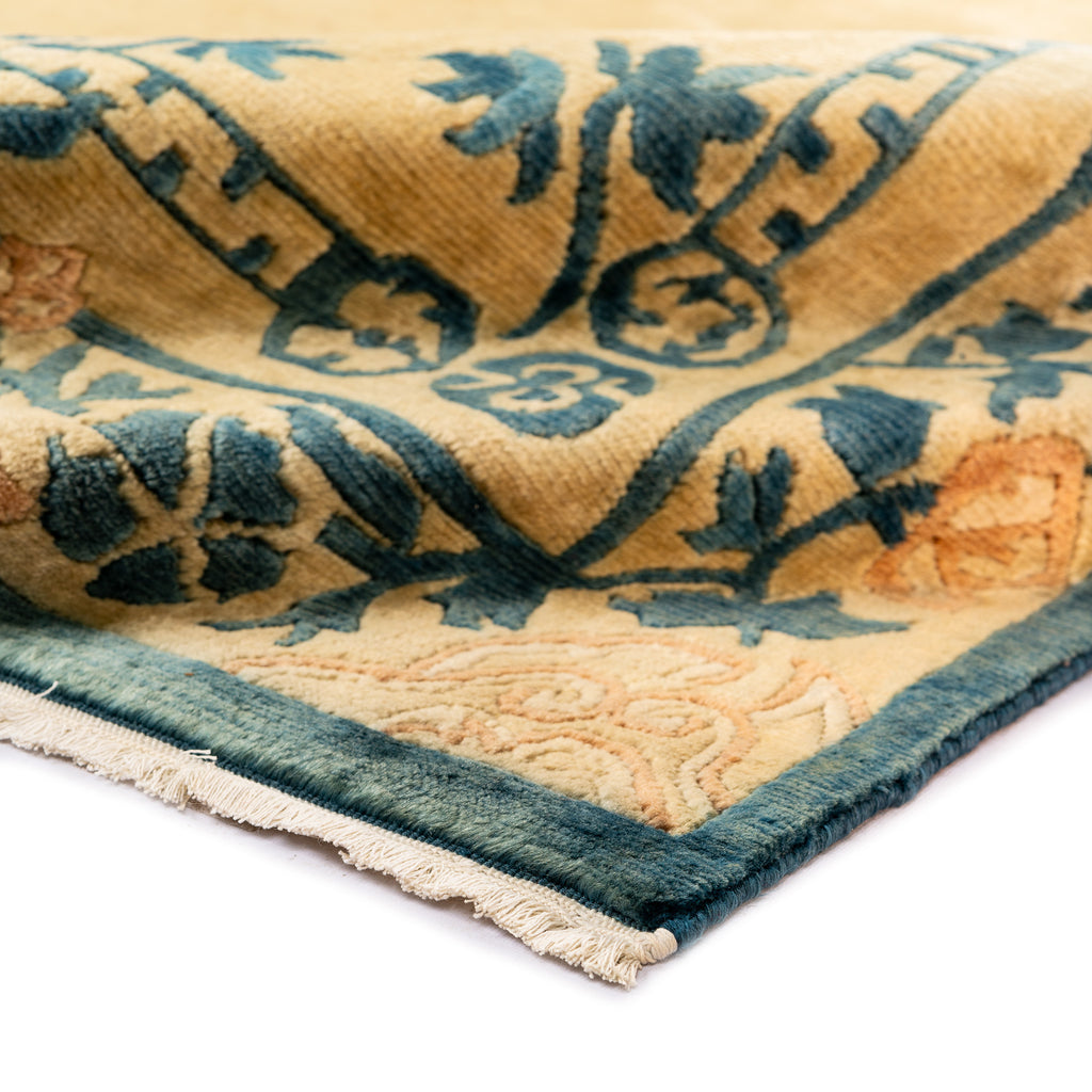 The designs on these Classical Chinese inspired carpets are taken from the patterns used by Chinese porcelain painters and artisans, which had been one of the favorite themes in Chinese crafts and paintings for centuries. The patterns also show old religious symbols with distinguished dragon patterns. The symbols on these carpets have Buddhistic origins, including clouds, floral designs, and ancient animals like dragons and phoenixes.