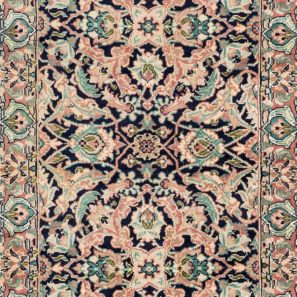 The carpets are manufactured with high knot density, warp, and weft of cotton, and the wool for the pile is of high quality. The patterns consist of beautifully designed medallions, niches, trees, and figural motifs, and all-over floral motifs occur also. Dominating colors are blue, red, and beige.