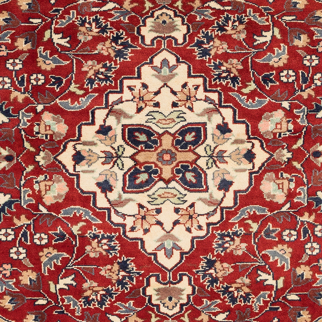 The carpets are manufactured with high knot density, warp, and weft of cotton, and the wool for the pile is of high quality. The patterns consist of beautifully designed medallions, niches, trees, and figural motifs, and all-over floral motifs occur also. Dominating colors are blue, red, and beige.