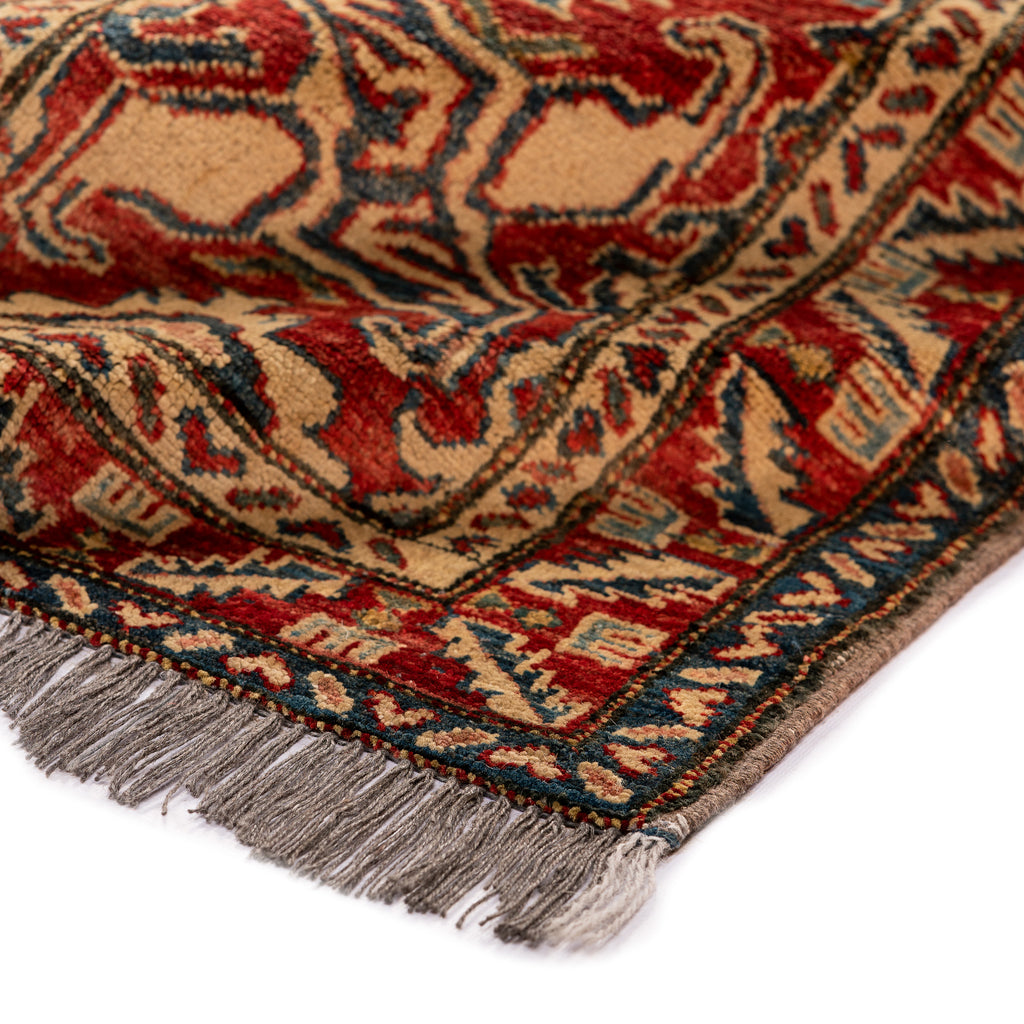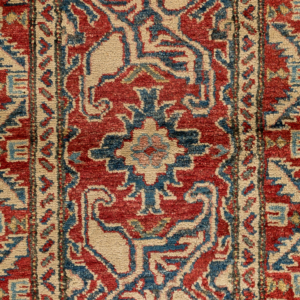 Typically, geometric in pattern Kazaks tend to be red, yellow, or gold and blue. Designs may include wildlife, flowers, and medallions similar to tribal rugs but are typically implemented with straight lines. The borders are heavily decorated featuring several variations of the latch-hook pattern and a reciprocal saw-tooth pattern often seen in Caucasian designs.