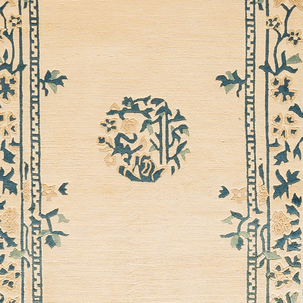 The designs on these Classical Chinese inspired carpets are taken from the patterns used by Chinese porcelain painters and artisans, which had been one of the favorite themes in Chinese crafts and paintings for centuries. The patterns also show old religious symbols with distinguished dragon patterns. The symbols on these carpets have Buddhistic origins, including clouds, floral designs, and ancient animals like dragons and phoenixes.